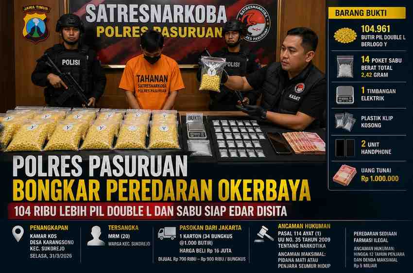Penangkapan dilakukan pada Selasa malam (31/3/2026) di sebuah kamar kos di Desa Karangsono, Kecamatan Sukorejo, yang diduga menjadi titik distribusi. Dari lokasi tersebut, petugas menyita 104.961 butir pil berlogo Y, 14 poket sabu seberat total 2,42 gram, timbangan elektrik, plastik klip kosong, dua unit ponsel, serta uang tunai Rp1 juta yang diduga hasil transaksi.
